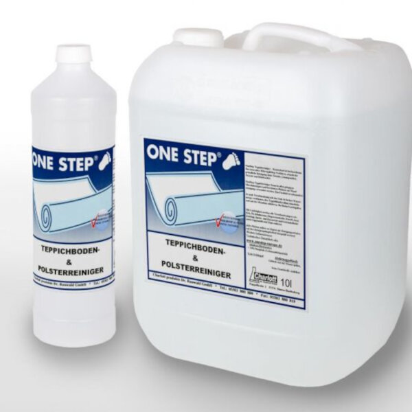 ONE STEP® Teppichboden- und Polsterreiniger ist in seiner Zusammensetzung ein sehr effektives Reinigungsmittel. Es kann für alle Maschinentechnologien eingesetzt werden (Sprühextraktion, Bonnet, etc.) und entfernt extrem starke Verschmutzungen sowie hartnäckige Flecken verursacht durch Fett, Öl, Dispersionsfarbe, Eiweiß, Senf, Ketchup, Schuhcreme, diverse Essens- und Getränkerückstände, verschiedenste Arten von Tinte, Aerosolschmutz, Zucker, Kaugummi, Wachs, Teer, Lippenstift, Blut, etc.