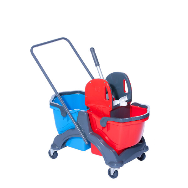 Robuster Doppelfahrwagen mit zwei Eimern 17 l und Führungsdeichsel aus Kunststoff.