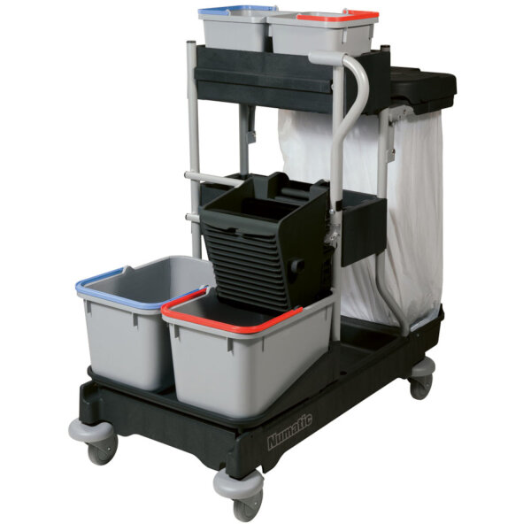 Stabiles Chassis aus Structofoam-Material und Metallrohren pulverbeschichtet Flexible Universalabfalleinheit (2 x 70 Liter oder 1 x 120 Liter) Stabile Universalpresse mit Eimer 2 x 17 Liter farbcodiert Zwei schmale Ablageschalen und 2 x 6 Liter Oberflächeneimer Universalpresse mit 2 Jahren Garantie